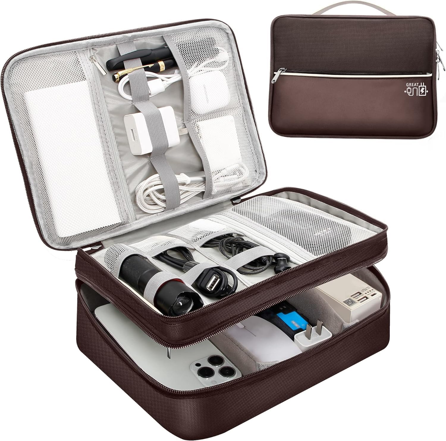 FunBlast Electronics Accessories Organizer Bag, Universal Carry Travel Gadget Bag, Double Layer Travel Cable Organizer Bag, Large Waterproof Electronic Accessories Storage Case (Brown)
