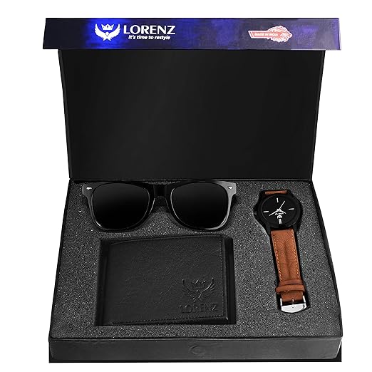 LORENZ Combo of Black Men’s Wallet, Sunglasses & Watch | Choose Any one | Brown Wallet, Army Design Wallet, Blue Wallet or Black Wallet